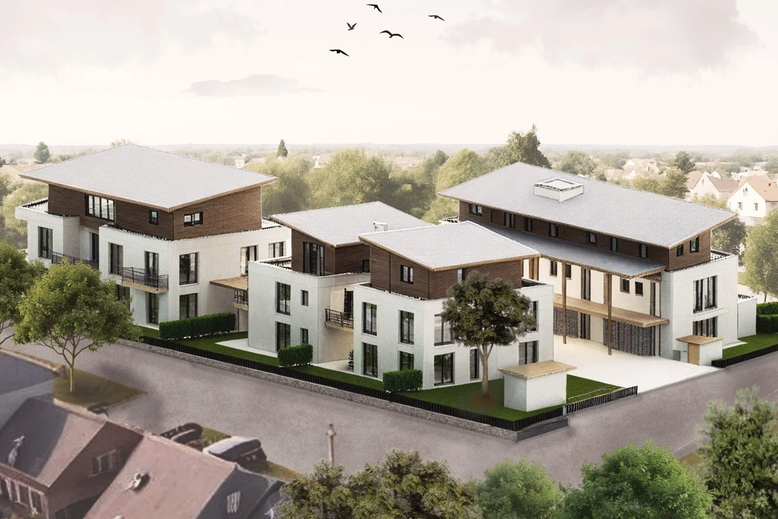 < > Vogelweide, NeufahrnNeubau Wohnensemble aus zwei Mehrfamilienhäusern und einem Appartementhaus mit TiefgarageMassivbauweiseLPH 1-4genehmigt 2021